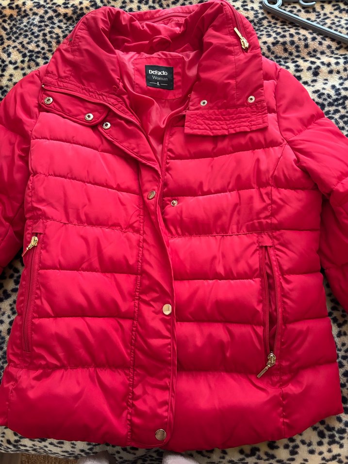 Kırmızı, uzun kollu, yaka detaylı, parlak görünümlü, kadın kışlık mont. Rahat ve sıcak tutar. ❄️