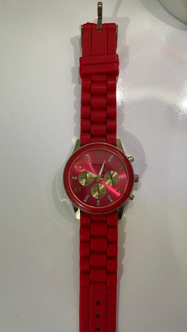Canlı kırmızı kayışa ve altın detaylı renkli kadrana sahip kadın kol saati, minimalist tasarım . ⌚ Az kullanılmış çalışır durumda pili yoktur