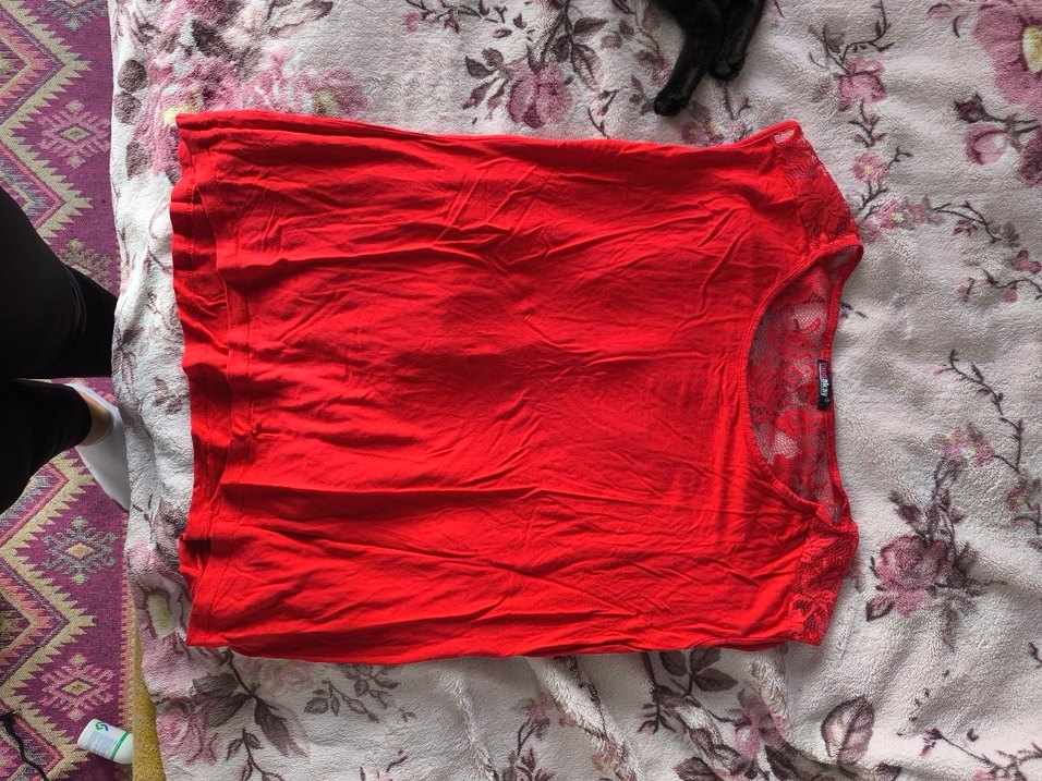 Kırmızı parlak renkte, kolsuz, keten kumaştan yapılmış, tek renk ve drapeli, tekne yaka, midi uzunlukta, vücuda oturan kadın bluz. Minimalist bohem tarzda, günlük kullanım için uygundur.