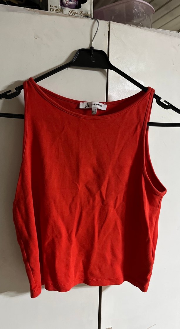 Pamuk kumaştan üretilmiş, yüksek yakalı ve kolsuz, parlak kırmızı renkte, normal boyda, günlük sokak stili için uygun dar kesim kadın atlet.