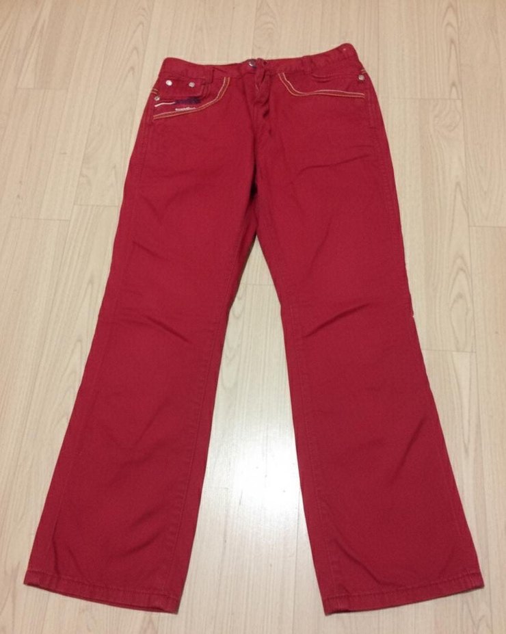 Kırmızı sentetik kumaştan, normal boy ve regular fit kadın pantolon. Bel detaylı, desensiz ve günlük sokak modasına uygun.