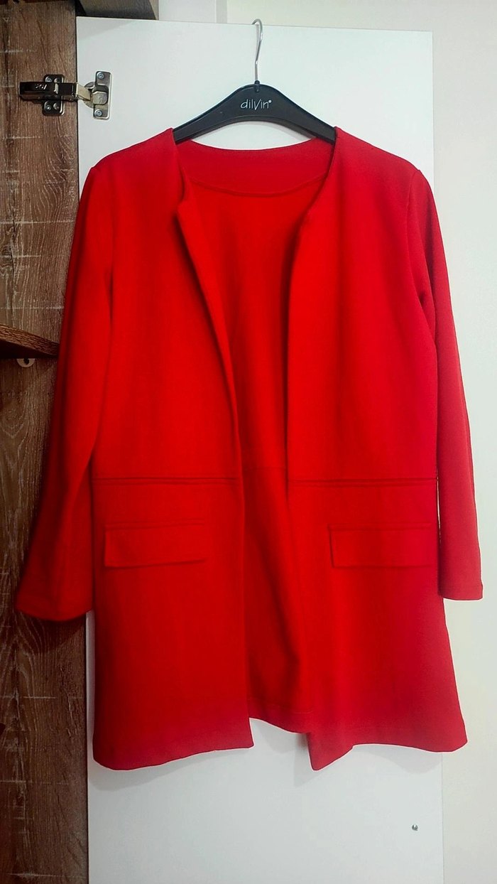 Kırmızı kadın ceketi, düğmeli ve keskin yakalıdır. Uzun kollu, normal kesim ve parlak yüzeye sahiptir. Ofis kullanımı için uygundur.