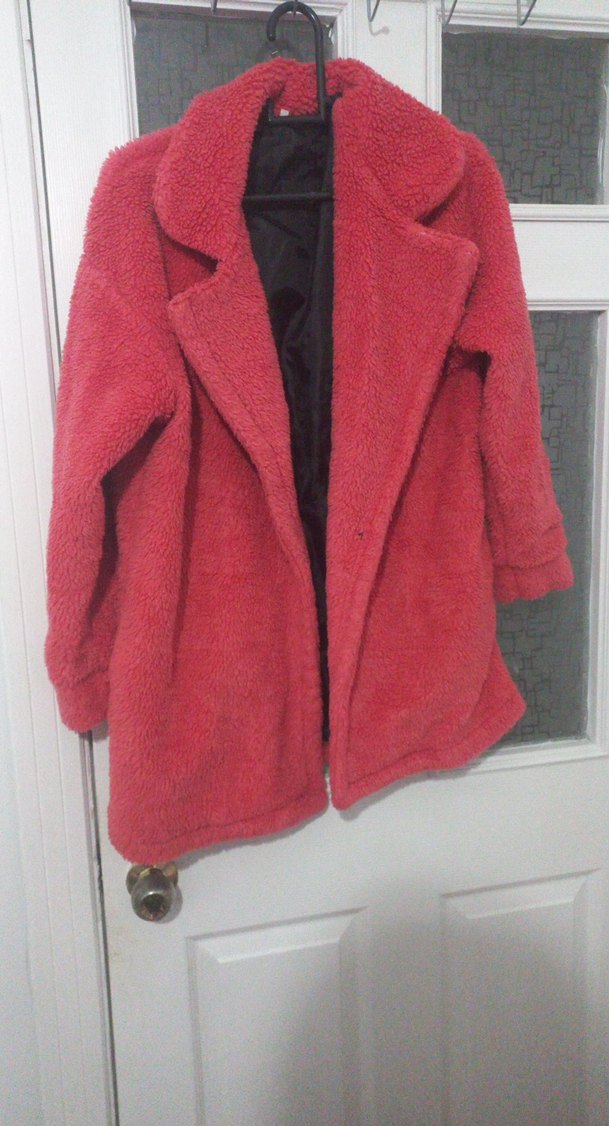Kadınlar için yumuşak ve sıcak peluş kumaştan yapılmış, uzun kollu ve kırmızı renkte midi boy bol kesim kaban. Yakası kırmalı ve kürk detaylıdır. pazarlık payı vardır