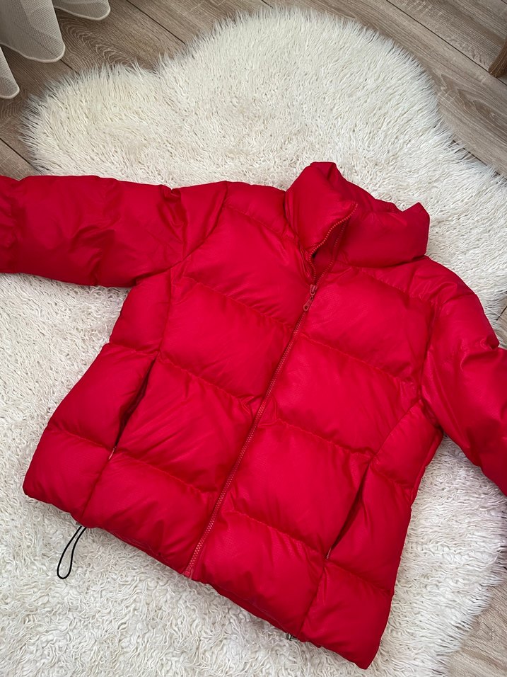 Kırmızı renkli, yüksek yakalı ve uzun kollu kadın montu. Yumuşak ve sıcak kumaştan üretilmiş, midi boy ve sokak stili için uygun. Temiz ve az kullanılmıştır.