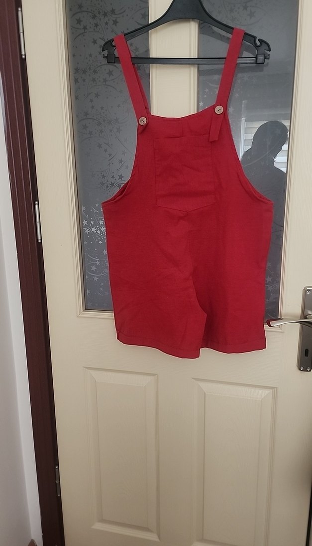 Keten görünümlükumaştan, bol kesim kırmızı askılı mini şort tulum.En iki kol arası 48 cm günlük rahat kullanıma uygun.
