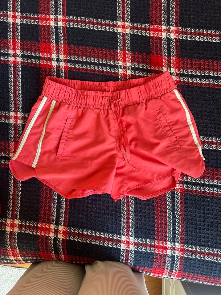 Kırmızı mini, bel kemerli ve yan cepli, sentetik kumaştan yapılmış fit kesim şort. Dış mekan ve sokak stili için uygundur.