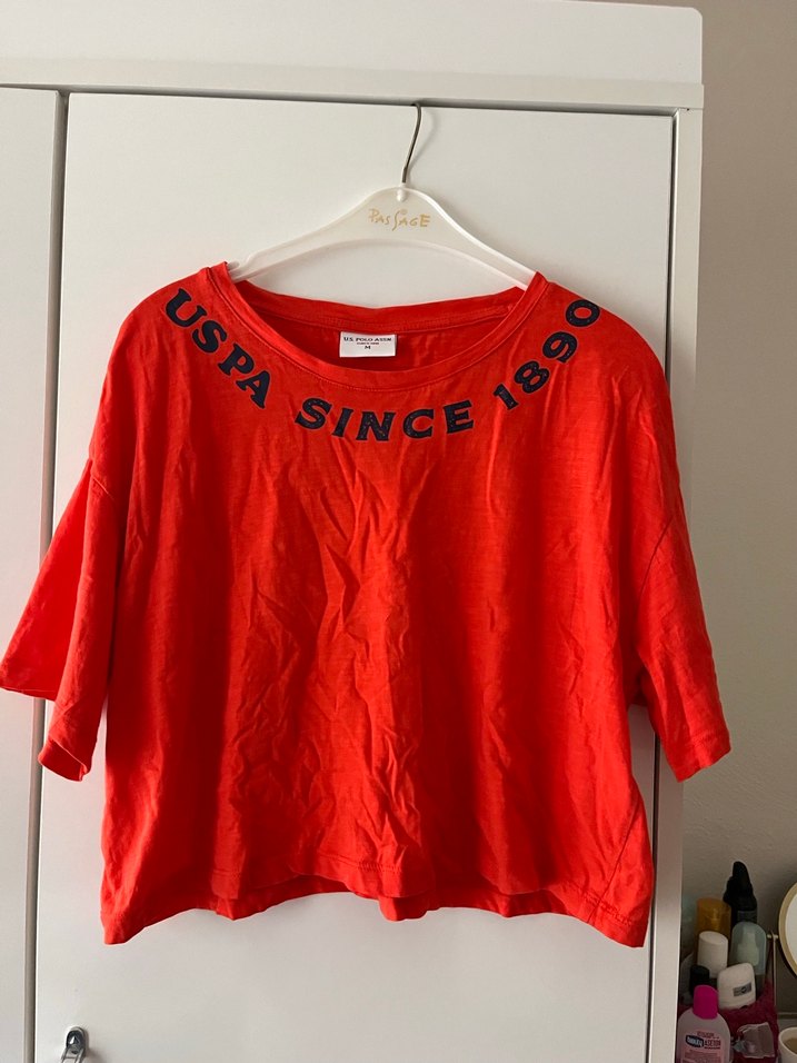 Kısa kollu, yuvarlak yakalı kırmızı kadın tişört hiç kullanılmadı etiketi mevcut değildir hiçbir kusuru yoktur