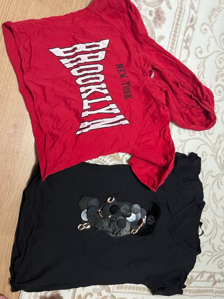 Kırmızı pamuklu kumaştan, uzun kollu, bol kesim ve yuvarlak yakalı. 'BROOKLYN' baskılı, payet detaylı, günlük sokak tarzı için uygun.