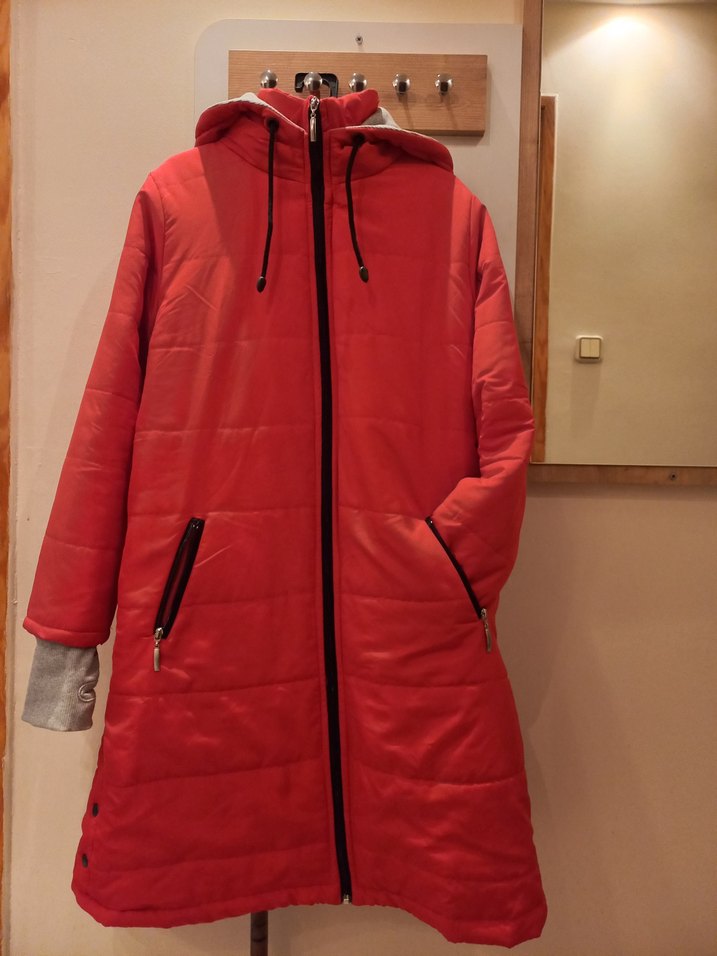 Kırmızı renkte, ön fermuarlı ve ayarlanabilir siyah ipli, xl beden birkez giyildi tertemiz