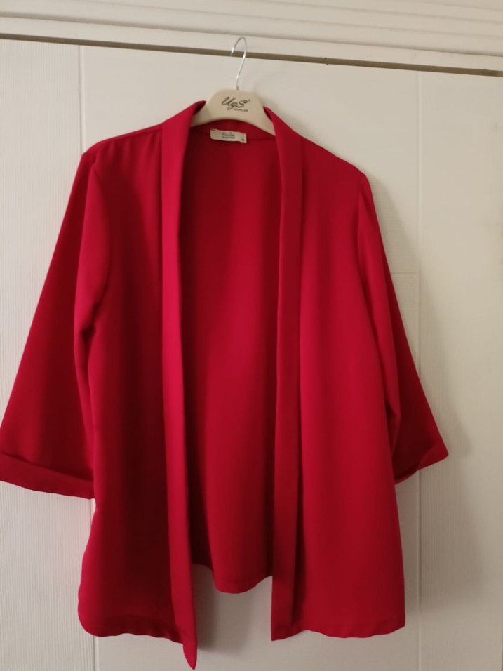Kırmızı, bol kesim kadın ceketi, kesik yakalı ve 3/4 kolludur. şık bir ceket
