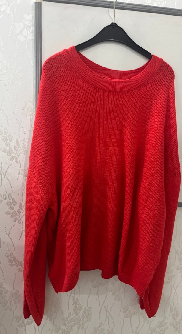 Kırmızı örgü kadın kazak, bisiklet yaka ve uzun kollu, bol kesim ile rahat ve günlük sokak stili sunar.
