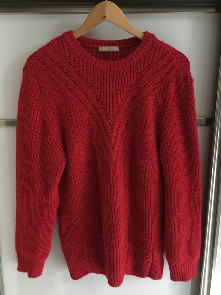 Kırmızı, örgü triko kazak, yuvarlak yaka ve uzun kolludur. Rahat, normal midi boyunda, yumuşak dokulu ve parlak görünümlüdür. Günlük kullanıma uygundur.