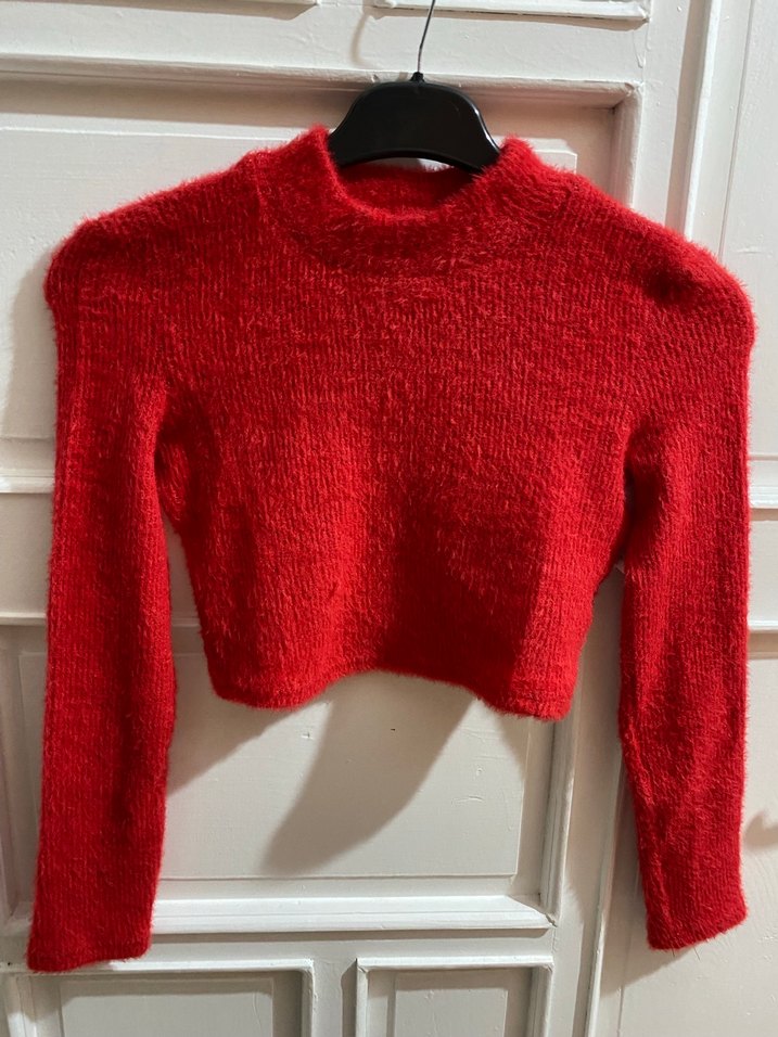 Bu kırmızı örgü kazak, uzun kollu ve bisiklet yaka detaylarıyla, günlük sokak stili için uygun, kısa ve vücuda oturan kesime sahiptir.