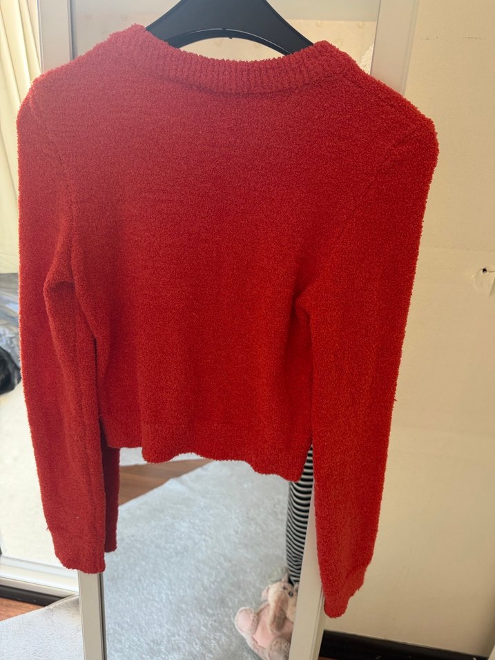 Kırmızı, yün kumaştan örülmüş, uzun kollu, bisiklet yaka ve normal midi uzunlukta, rahat ve şık kadın kazak. Sokak stiline uygun, desensiz tasarım.