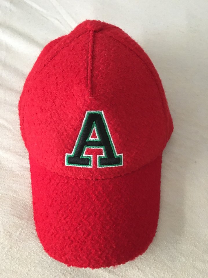 Kırmızı renkli, yumuşak ve sıcak dokulu kadın örme şapka, üzerinde renkli 'A' harfi işaretli, spor ve sokak giyim tarzına uygun.