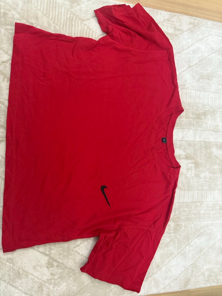 Kırmızı renkli kadın tişörtü, oversize kesim ve kısa kollu. Keten kumaştan, drapeli ve sade tasarımlı. Günlük kullanım ve sokak stiline uygun. Nike logosu mevcut.