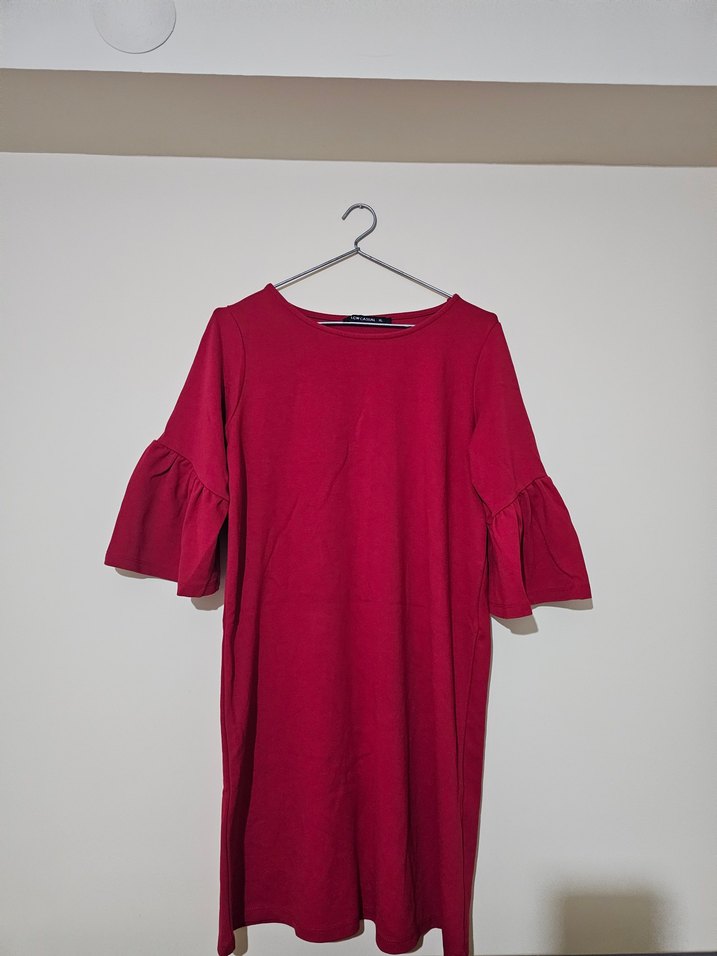 Kırmızı pamuklu midi elbise kısa drapeli kollu, yuvarlak yakalı, bol kesim midi elbise. Geniş bir şekilde giymek isteyen 38-40 beden kullanıcılara hafif bol duracaktır gayet şık duruyor. 42-44 beden giyen kullanıcılara tam olacaktır.