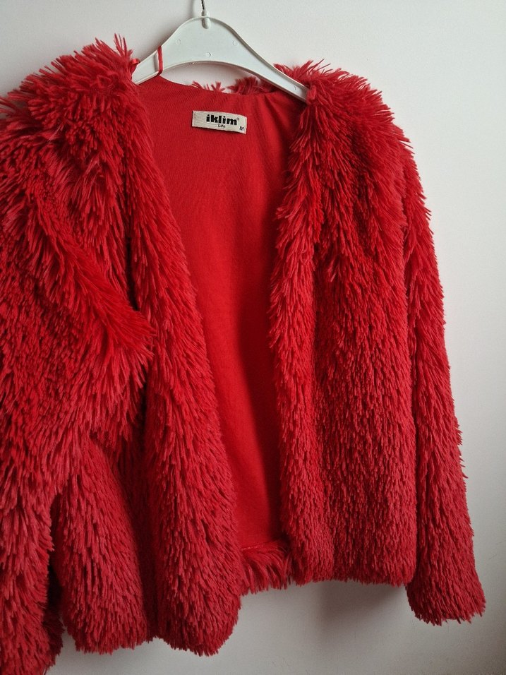 Yumuşak polar kumaştan, uzun kollu ve bol kesim kırmızı peluş kürk ceket. Notlu yaka detaylı, desen içermeyen, günlük sokak tarzı için uygun. Marka: iklim
