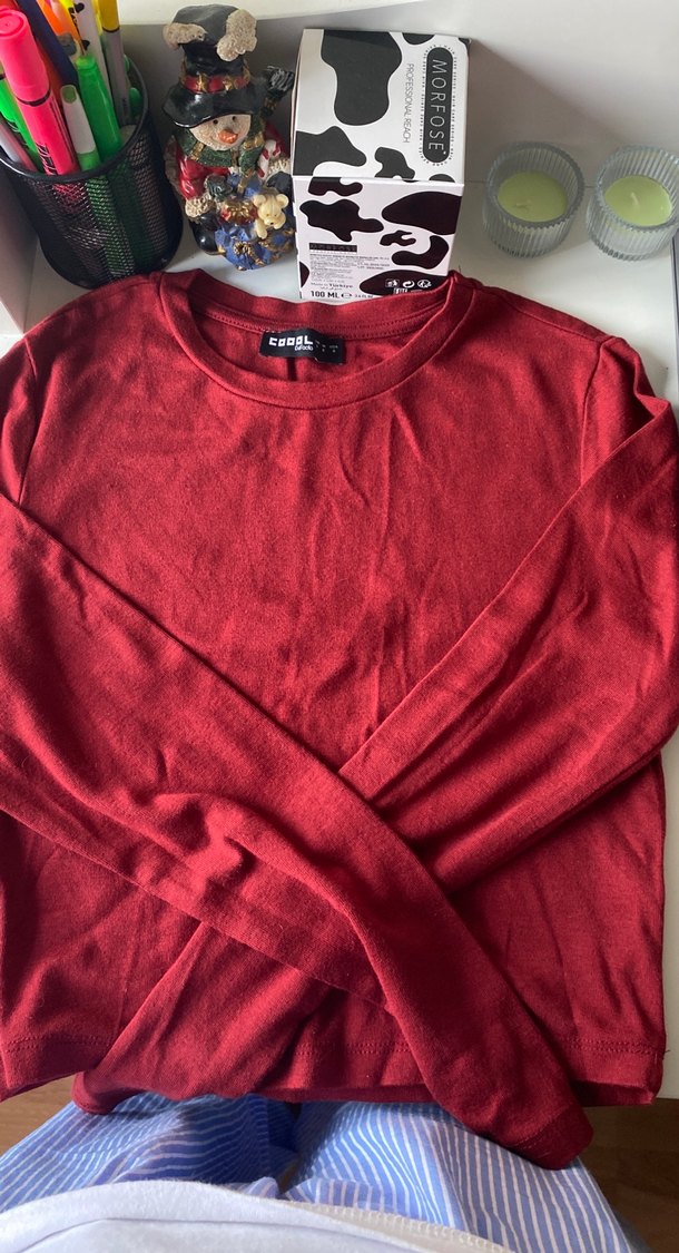 Dar kesim, uzun kollu kırmızı yün penye. Yuvarlak yaka ve parlak görünümüyle günlük kullanıma uygun rahat bir parça.