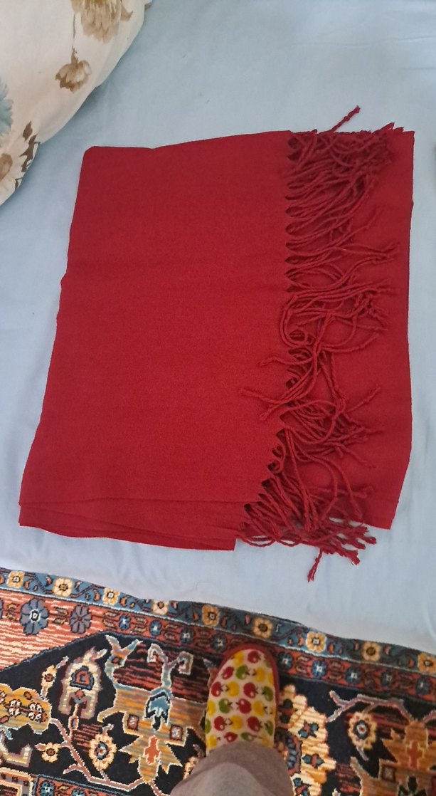 Canlı kırmızı renkte, yumuşak ve sıcak kumaştan yapılmış, püskül detaylı kadın şalı. Rahat ve bohem tarzda, sade ve konforlu kullanıma uygun.