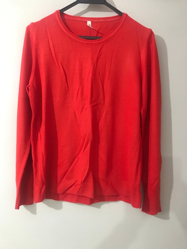 Kırmızı renkte, yuvarlak yaka ve uzun kollu, salaş kesim, normal boyda kadın kazak. Minimalist, desensiz ve sentetik kumaştan üretilmiştir, günlük ve sokak stiline uygundur.