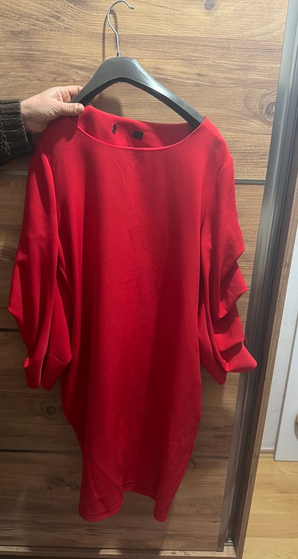 Kırmızı kadın tunik, yuvarlak yaka ve drapeli uzun kollara sahiptir. Salaş kesim ve normal midi boyda, yumuşak ve sıcak kumaştan üretilmiştir. ✨