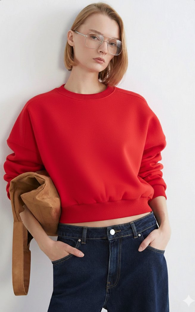 Kırmızı,yuvarlak yaka ve uzun kollu kadın crop sweatshirt. Salaş kesim,rahat sokak stili için uygundur.