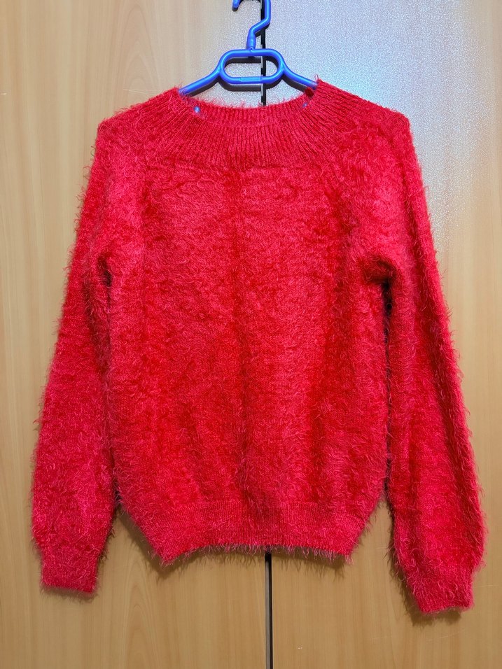 Kırmızı, örme kumaştan yapılmış, yuvarlak yakalı ve uzun kollu salaş bir kazak. Rahat ve renkli sokak tarzı için uygundur. M beden