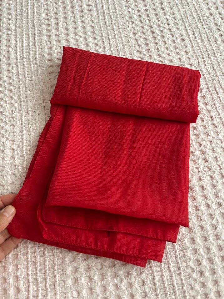 Kadınlar için kırmızı, parlak ve saten dokulu, drapeli şal. Rahat ve klasik tarzda bir aksesuar.