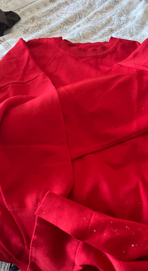 Fitted kesim, kırmızı parlak saten kumaştan yapılmış, yuvarlak yakalı ve uzun kollu kadın sweatshirtü. Düz ve drapeli tasarıma sahip, günlük athleisure ve streetwear için uygun midi uzunlukta.herbedene uygundur