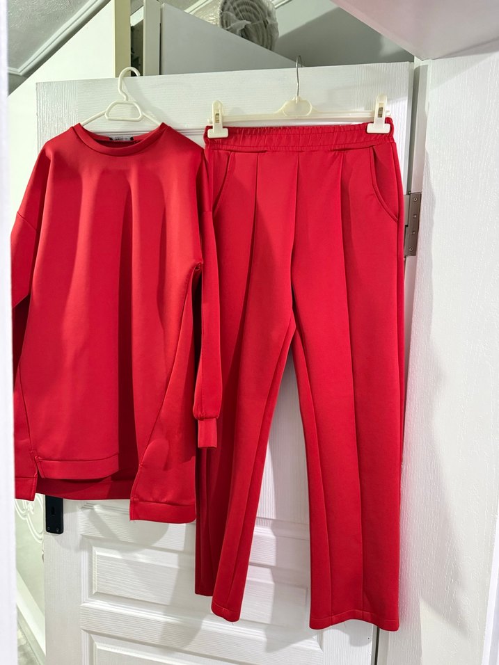 Kırmızı, uzun kollu, yuvarlak yaka üst ve uzun paça pantolondan oluşan kadın eşofman takımı. Yumuşak ve sıcak kumaştan, rahat kesim ve zahmetsiz şıklık sunar.
