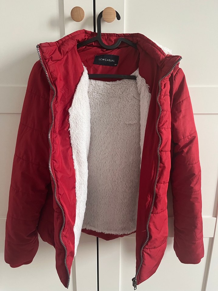 Kırmızı, vücuda oturan kadın kış montu, yüksek yakalı ve uzun kolludur. İç kısmı yumuşak ve sıcak kürk detaylıdır.