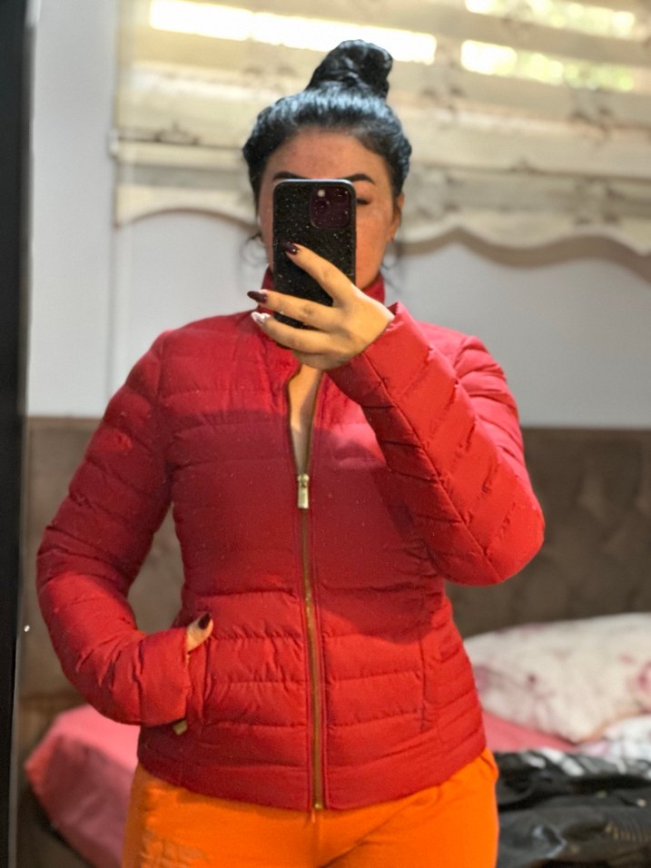 Kırmızı, parlak ve fermuarlı, yüksek yakalı kadın montu. İnce kesimi ve uzun kollarıyla günlük sokak stiline uygun sıcak tutar.