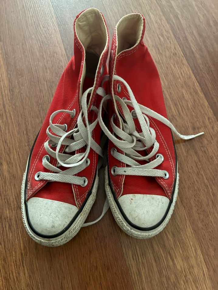 Kırmızı kadın spor ayakkabısı, beyaz bağcıklı ve düz kauçuk tabanlı, sportif ve günlük kullanıma uygun sade tasarım.