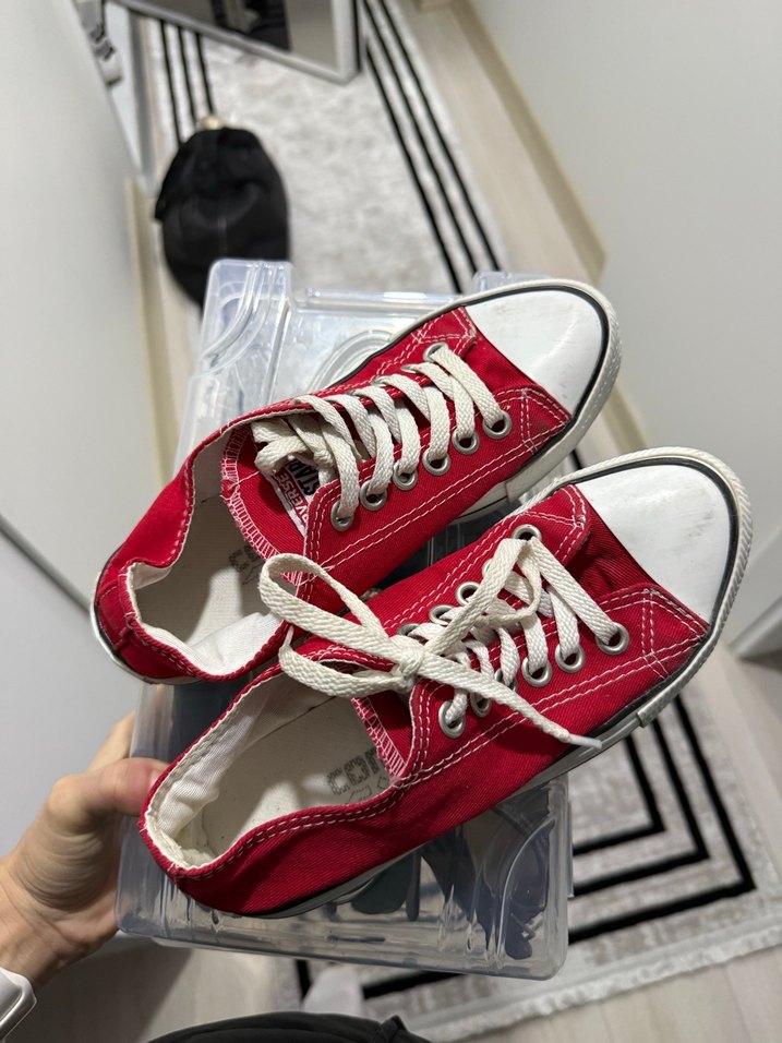 Kırmızı renkte, düz tabanlı, rahat ve şık kadın spor ayakkabısı. Günlük kullanım için uygun, desen içermeyen sade tasarım sunar. (Replika) hiç bir defosu yok 2-3 kez giyildi
