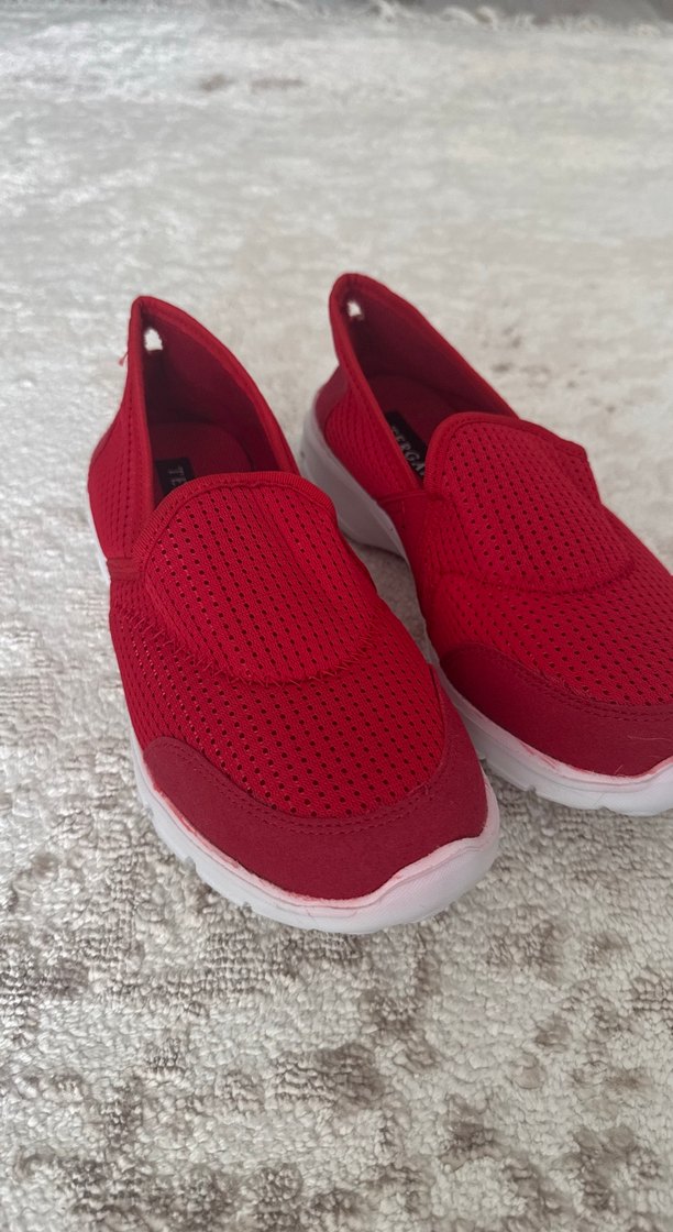 Kırmızı kadın spor ayakkabı, kalın tabanlı ve Velcro bantlıdır. Nefes alabilen malzeme ve kauçuk tabanlıdır. Tergan marka hiç kullanılmamıştır
