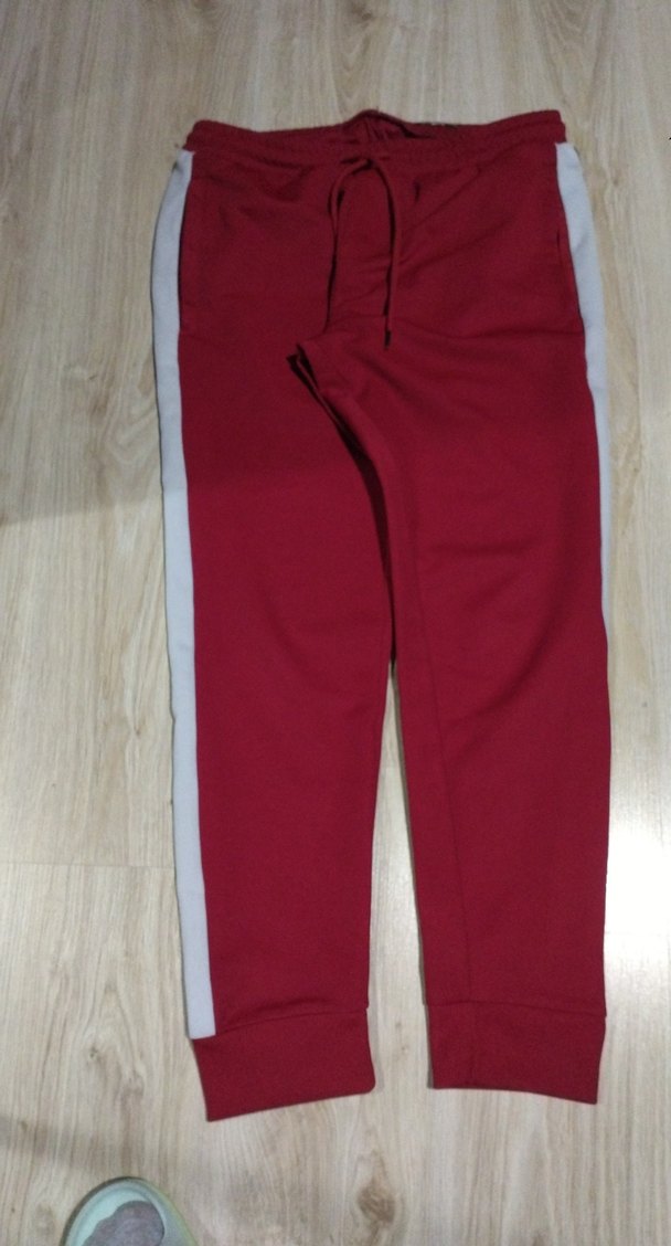Kırmızı kadın kumaş pantolon, elastik bel ve beyaz yan şerit detaylı, günlük kullanım için rahat sentetik kumaştan yapılmıştır.