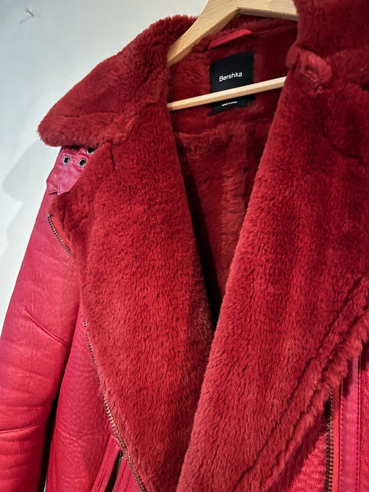 Kırmızı süet malzemeden yapılmış, kürklü detaylı, kalça altı boy ve fitted kesim kadın kışlık ceket. Notch yakalı, askılı kollu ve mat görünümlü, deformesi yok, yaka kısmı daha koyu kırmızı.