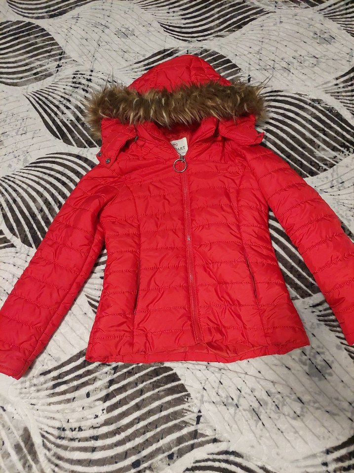 Kırmızı renkli, suni kürk detaylı kapüşonlu, uzun kollu, ince kesim kadın kışlık mont. Rahat ve sıcak tutan sentetik kumaştan yapılmıştır. ❄️