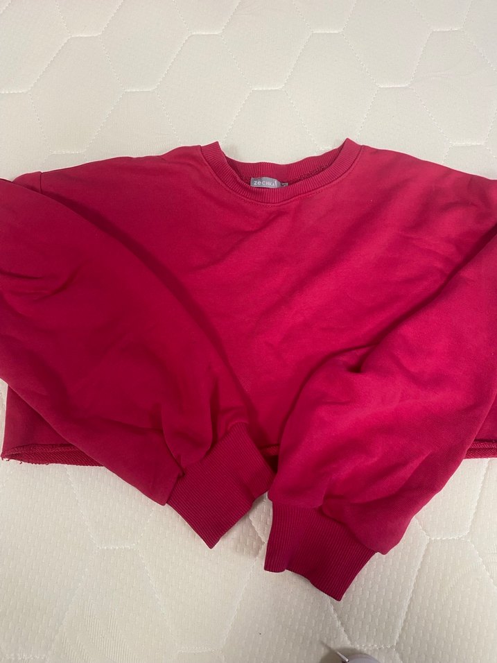 Kırmızı kadın sweatshirt, bisiklet yaka ve uzun kollu. Salaş kesimi ve yumuşak, sıcak kumaşıyla günlük sokak stili için sade ve rahat bir parça.