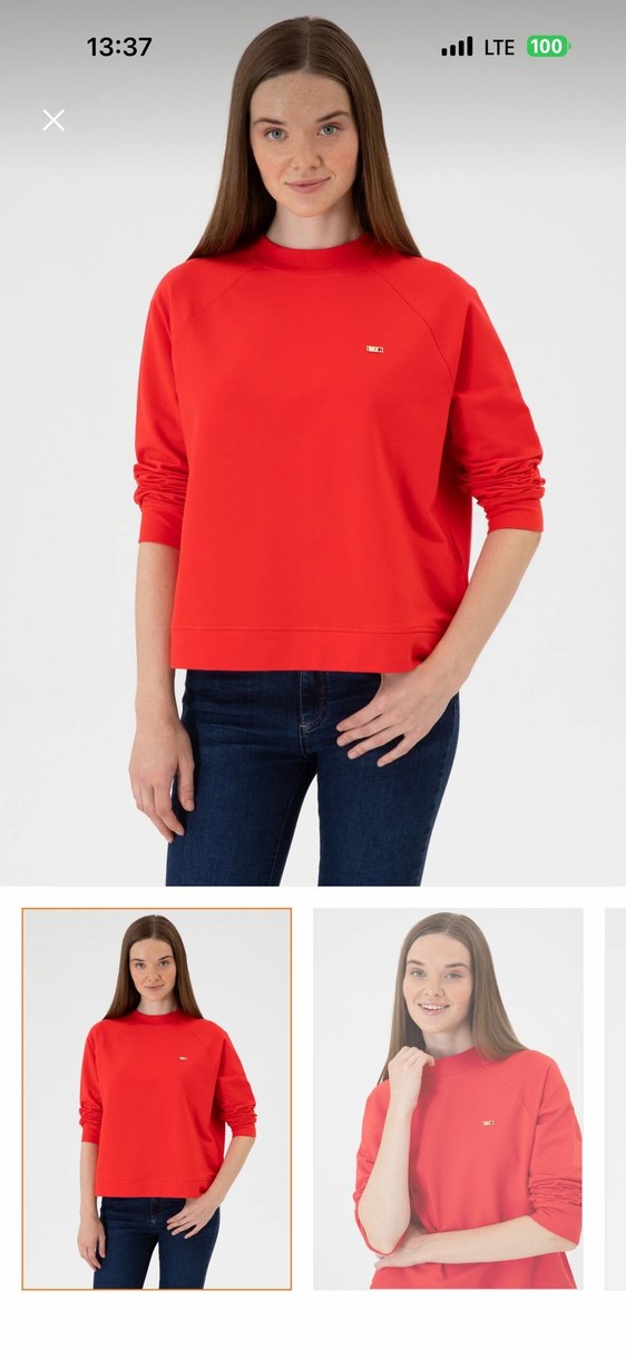 Kırmızı kadın sweatshirt, yuvarlak yaka ve uzun kollu, rahat kesimdir. Yumuşak ve sıcak kumaştan yapılmıştır, gündelik kullanım için uygundur.
