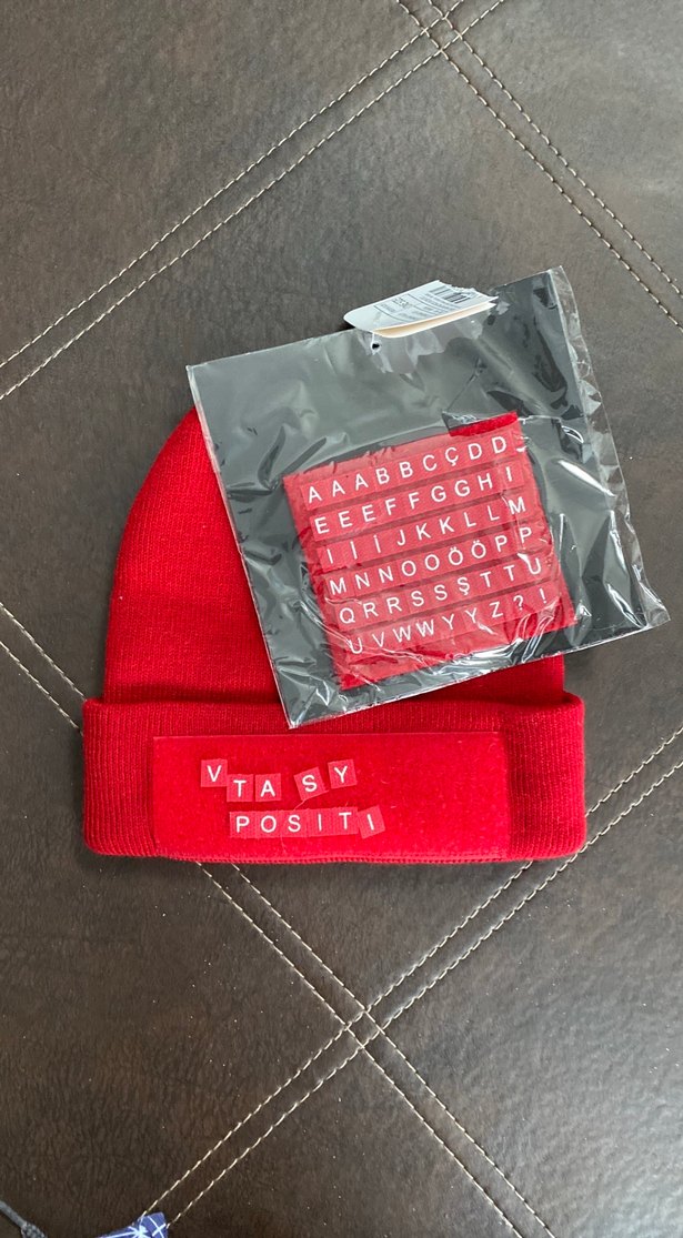 Yumuşak kumaştan kırmızı triko bere, sokak modasına uygundur. Üzerinde vırt cırtlı mesaj harfleri vardır.
