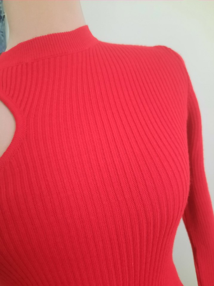 Kırmızı, bisiklet yaka, uzun kollu, vücuda oturan triko Elbise. Canlı renkte, rahat ve çağdaş bir stil sunar.