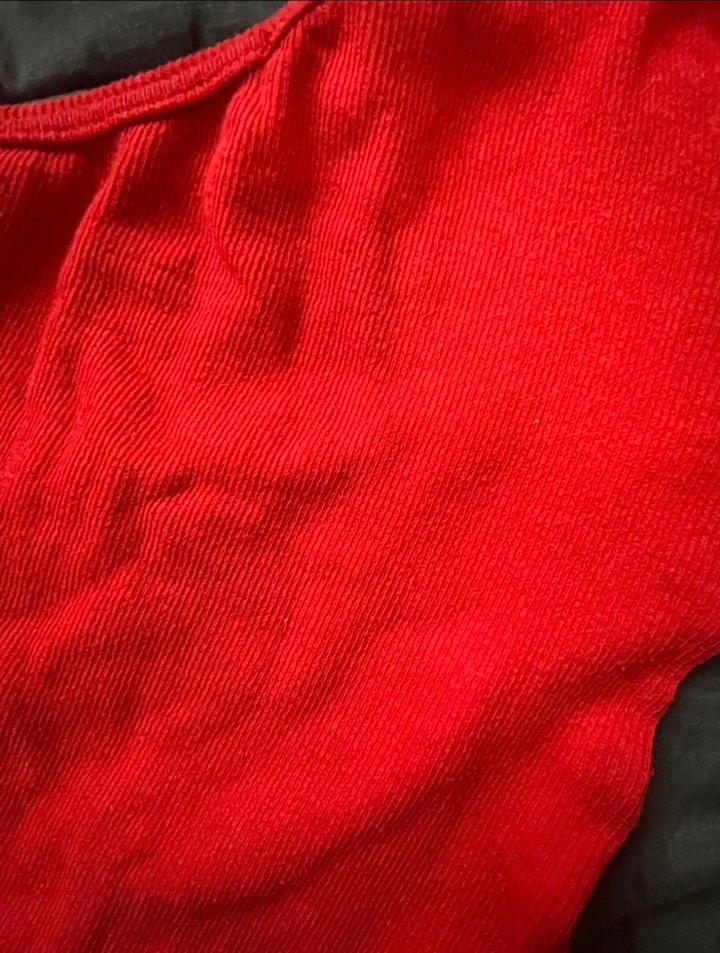 Koyu kırmızı renkte, triko dokuma, dar kesim kadın bluz. Uzun kollu ve tek renk, rahat ve şık bir günlük sokak stili parçası.