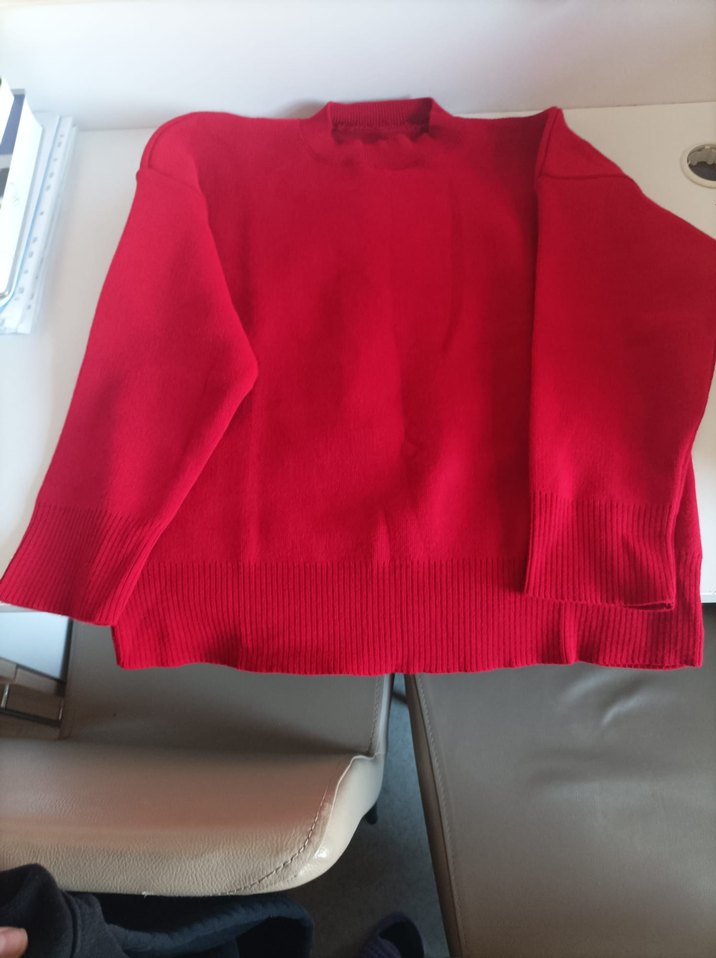 Kırmızı, yuvarlak yakalı ve uzun kollu kadın triko kazak. Yumuşak ve sıcak dokusu, bol kesimi ve normal boyuyla rahat günlük kullanım için uygundur. Parlak kırmızı renkte, desensiz. standart beden