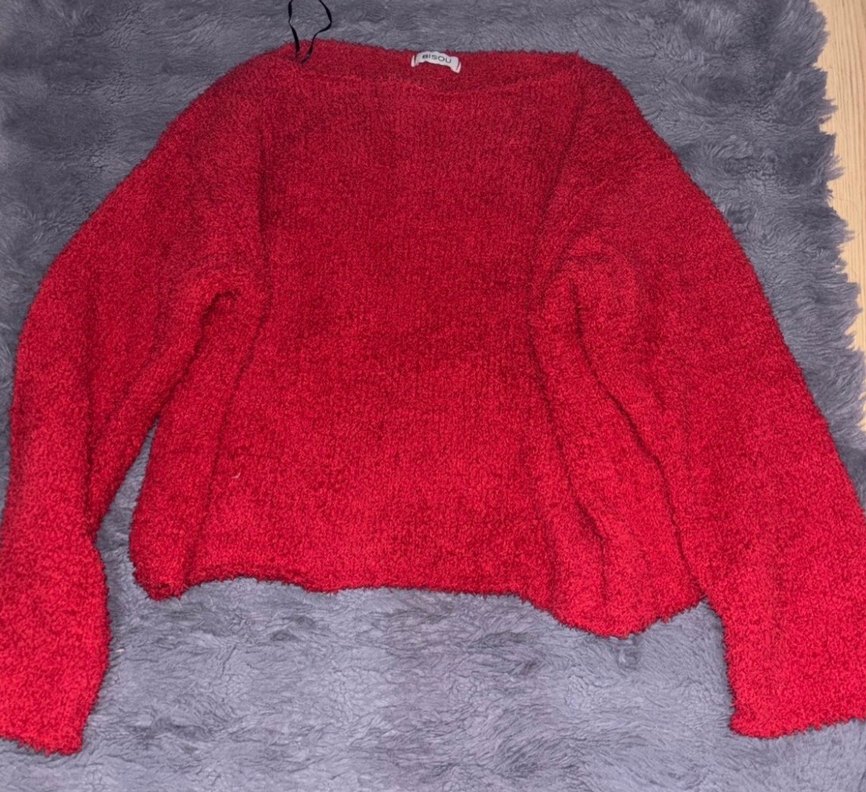 Kırmızı renkli, uzun kollu, bisiklet yaka ve gevşek kesim kadın triko kazak. Yumuşak ve sıcak kumaştan, günlük kullanıma uygun.