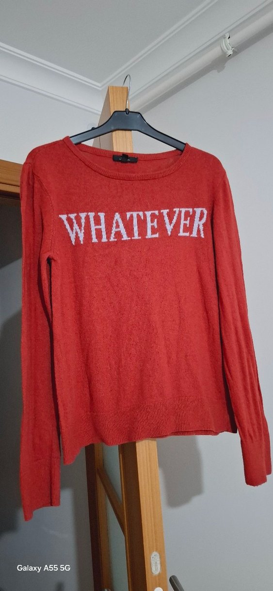 Kırmızı yün triko kazak, uzun kollu ve yuvarlak yakalıdır. Örme ve 'WHATEVER' baskılıdır, rahat ve trend sokak stili sunar. Günlük kullanıma uygundur.