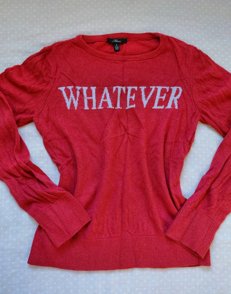 Kırmızı, uzun kollu kadın triko kazak, yuvarlak yaka ve rahat kesime sahiptir. Yumuşak keten kumaştan örülmüş, önünde "WHATEVER" yazısı bulunur. Parlak kırmızı tonu günlük ve athleisure tarzlara uygundur.
