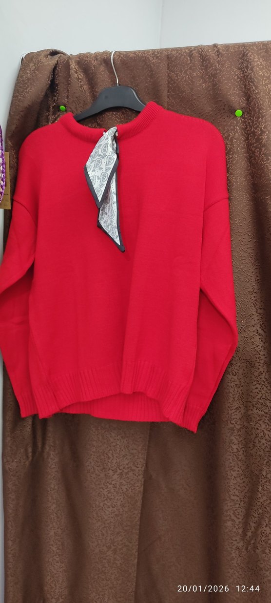 Kırmızı renkte, yuvarlak yakalı ve uzun kollu kadın triko kazak. Yumuşak örme kumaştan, salaş kesim ve rahat boyda, günlük sokak stili için uygun.