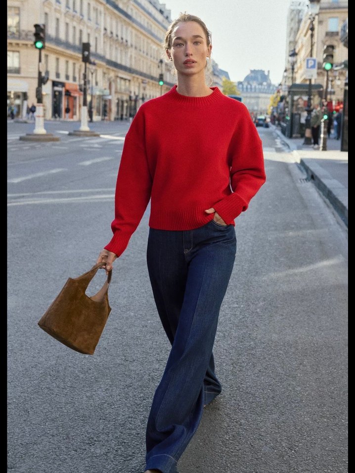 Kırmızı, triko süet kumaştan, bol kesim, bisiklet yaka ve uzun kollu, parlak yüzeyli midi uzunlukta kadın kazak.